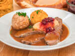 aus der Schweineschulter mit Paulaner Biersoß‘ und Kartoffelknödel